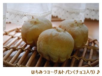 design++dalu++●●*●●*●●*●●*●●今日はなんとか曇り。。。娘はちょっと不安を抱えながらも、幼稚園に行きました同じバス停に、年少さんがいるのですが、昨日はスムーズにバスに乗り、帰りのバスも満面の笑みで帰ってきたのに、今朝は。。。”一人で行きたくない””かあさんと行く”娘の入園当初のことを思い出し、せつなぁくなって、泣いちゃいました二日続けて失敗パンをUPするのは悲しいのですが。。。記録のため。じゃがいもじゃないですよぉー。お友達の日記でみてとぉってもおいしそぉだったので、レシピ検索して作ってみたはちみつヨーグルトパンです中には娘の好きなチョコがたっぷり。。。生地はふわんふわんで、とぉってもおいしかったのですが、なんせ、、、形が悪すぎですねタルト型に丸めた生地をのせ、上をチョンチョンっと切って、あられ糖をのせてみたのですが。。。じゃがいもだぁ!そうそう。。。娘が帰ってきて”お友達できたよぉー”ってほっとして、とぉっても幸せな気持ちになっちゃいましたお友達さん、よろしくねぇー。●●*●●*●●*●●*●●