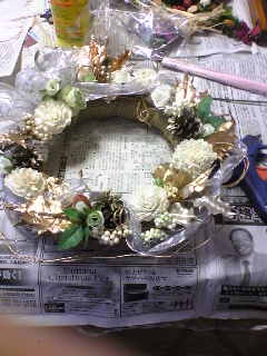 久しぶりにフラワーアレンジメント教室行ってきました♪♪ ☆☆☆クリスマスリース☆☆☆ こんなのできちゃいましたo(^-^)o 定番のではなく・・白っぽいリ-スを作りましたよ・・白いリボンに白い花☆☆白い花はソ-ラ-フラワ-です。木の皮で?作っている?花だそうです。 配置はかなりセンスを問われそうですが・・・f^_^; だんだん形になっていく時が特に 楽しいです♪♪