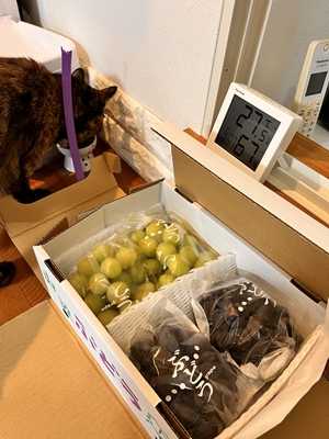 先生からOKが出たらやっとこ二回目の三種ワクチン同伴にくるみ君が今期の三種ワクチン接種でご同行チャイ嬢 リンパの腫れも無くなり 無事にくるみもチャイも三種混合ワクチン💉チックン💦お昼までかかり 昼ごはんはピザ長野の長男一家から敬老の日のプレゼントがシャインマスカットに巨峰(。・ω・。)ノ♡二足歩行者は激喜び四足歩行達も。。。