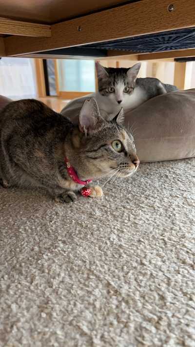 テーブルの下からテレビ見てます。