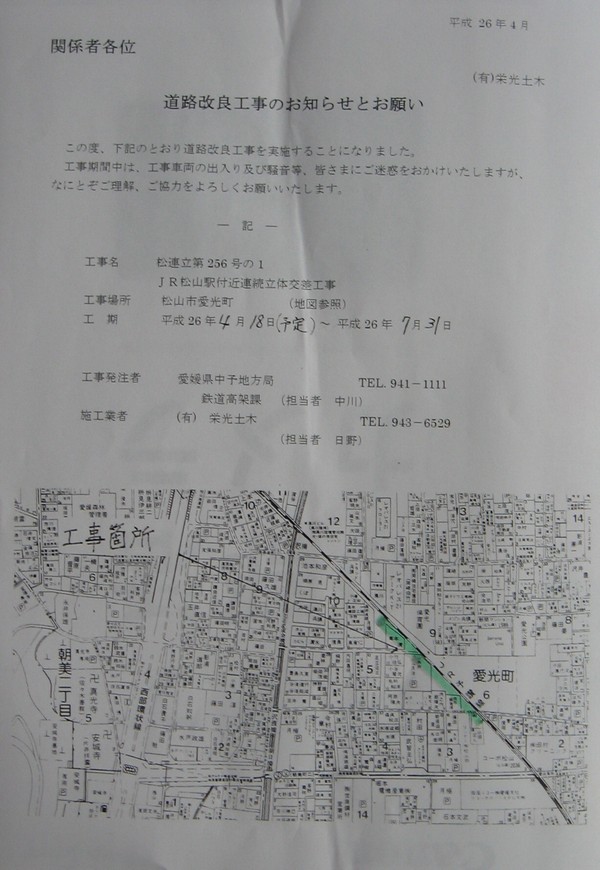 松山駅高架の側道工事が始まるらしい工事の案内がポストに入っていた