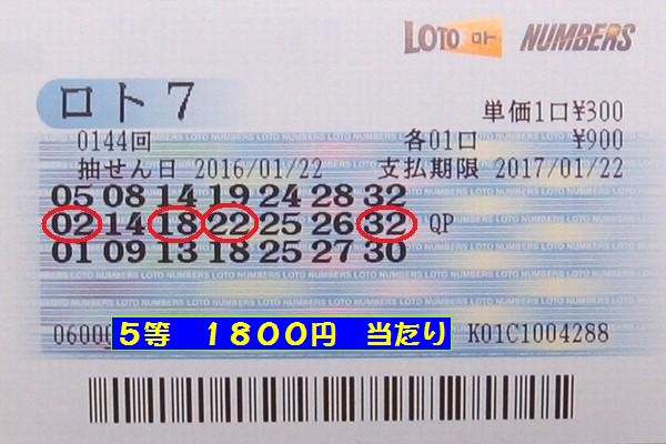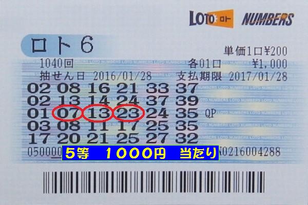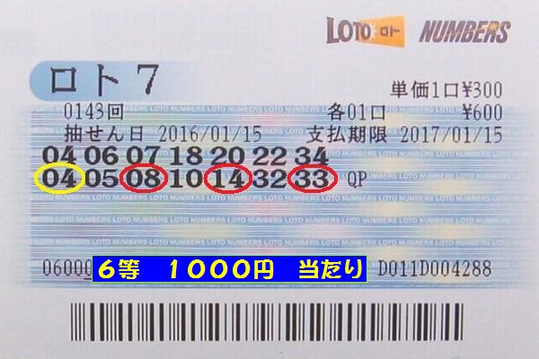 ロト7で、6等(4個)1000円が当たり!3個+ボーナス数字