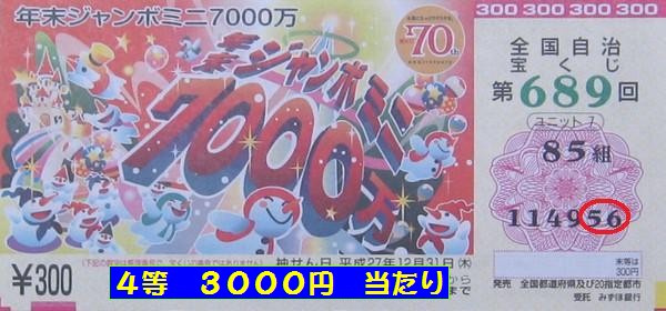 年末ジャンボミニ宝くじで、4等3000円が当たり!