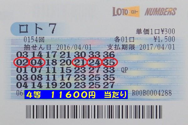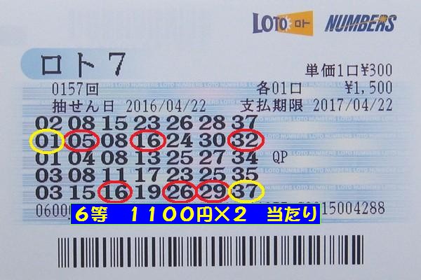 ロト7で、6等(4個)1100円が2本当たり!3個+ボーナス数字