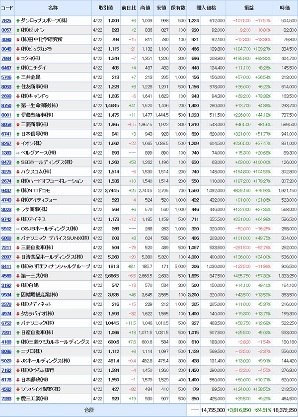 今週末は、+3,616,950円先週末にくらべて、+309,440円 今週の売買買:なし売:なし来週の売買予定買:なし売:なし 自動売買の本はこちらからどうぞ 株主優待ハンドブックはこちらからどうぞ