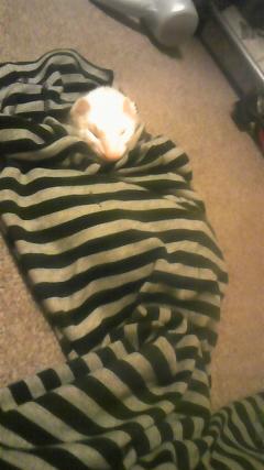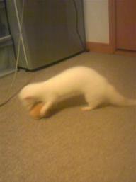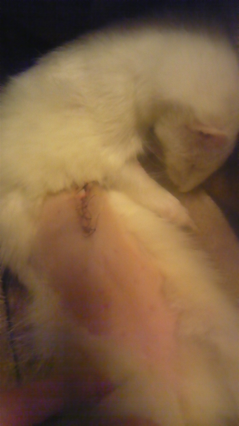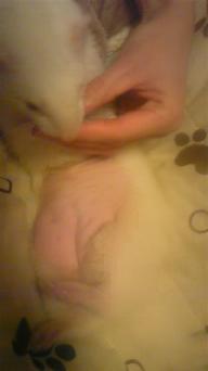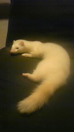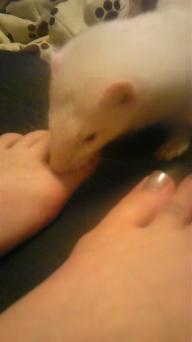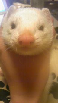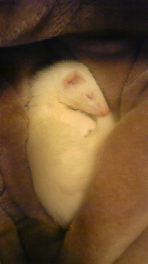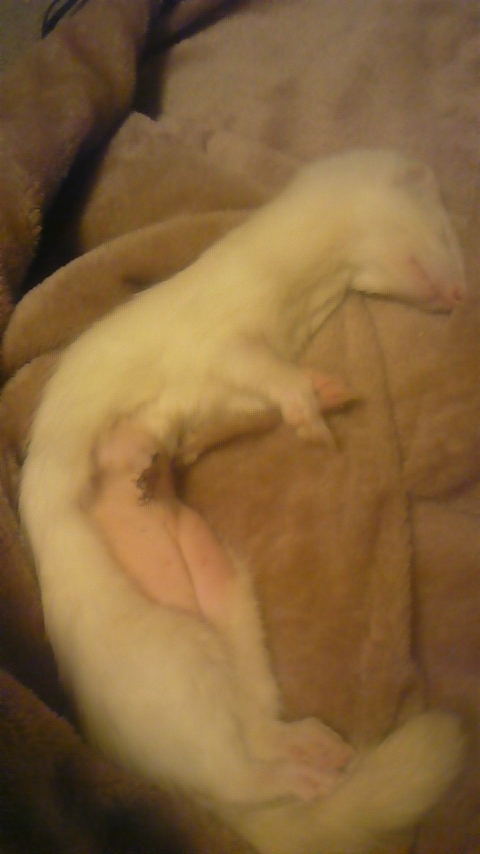 こんばんわー☆今日はムゥさんの爪切りました!!今までは、左手でムゥの首つかんで、プラーんてさせて右手で切ってたんだけど・・・左手で首つかむと上手くつかめず、威嚇しつつ脱走して、爪切るだけでもかなりの時間を要してました。が!!!フェレ仲間の爪切りの様子を撮った動画を発見!!なんとも簡単に切っているではないか!!!!ってなわけで、勝手に真似してみました。笑お腹にバイトを塗って、必死に舐めてる間に切っちゃおう作戦!! お腹の毛がまだ生えてないから、なんともブサイク・・・笑しかも、微妙に届いてない・・・笑 背景も白くて、見えづらいけども。。めっちゃ簡単に切れてビックリでした!!アキシカさん・・・感謝します`∀´ 笑ではでは、、おやすみなさいー。