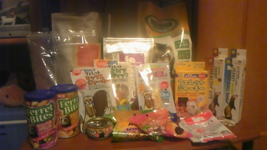今日は仕事が遅かったのだけど、さらにのその後ご飯食べ行って、今頃帰ってきました。。ってか、メタボちっくな今日この頃。。こんな時間に食べて大丈夫なのか・・・?遅くなったので、ムゥさんにはお土産におやつを買ってきました。色々あげればどれか食べるだろうと信じて買い続け・・・ここ最近、ムゥさんの餌が増えすぎました。しかも、全然食べてくれないから減らず・・・。山のようにありますよ!!!いっぱいあるけど、主食になる餌はこのうち4種だけ。あとは、おやつです。。そんでもって、今日もあらたに4種類買ってきました。だけども、一口食べてすぐに寝てしまいました。。。ちなみに、私のひざの上(´∀`)☆かわいすぐるー・・・しかし、体重は0.6キロまで落ちました。。