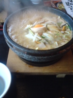 石焼ビビンバのような石の熱い器にスープをそそぐと