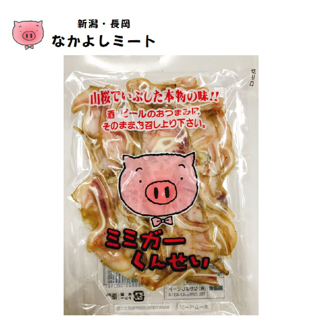 なかよしミート【ミミガーくんせい】山桜で燻したこだわりの味・豚の耳の燻製です。コラーゲン、カルシウムが多く含まれており特に女性に嬉しい逸品です。そのままでも好、たまねぎスライスや刻んだきゅうりと和えポン酢やドレッシングをかけても美味しくいただけます。