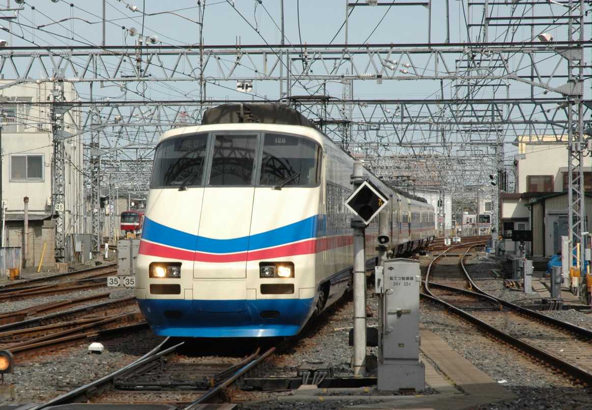3400形。特急上野行。1番線に入ってきています。ここでスカイライナーを退避するためです。