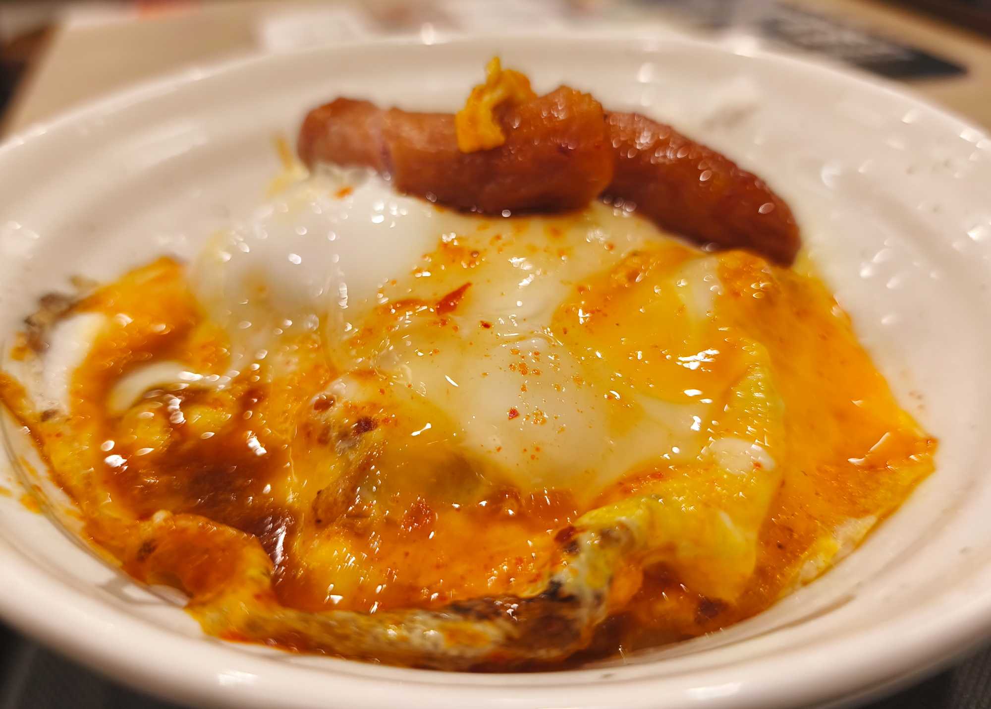 ご飯に半熟卵とソーセージがのっかっています。