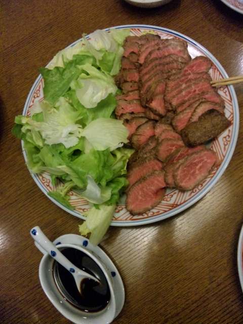 9月20日(木)、晴れです。少し空気が爽やかになりましたが、まだまだ暑い当地です。そんな本日も通常業務です。午前のお仕事終了…。午後の一時…、銀行へ行かなくては…。男子ツアー:パナソニックオープンの初日のトップ5は…1位 -9 池田 勇太 2位タイ -7 宮本 勝昌 2位タイ -7 小田 孔明 2位タイ -7 宮里 優作 2位タイ -7 藤田 寛之 3週連続2位の池田Pに優勝が来るのか…。藍ちゃんのお兄ちゃんと言われ続ける宮里Pの初優勝となるのか…。40代の星・藤田Pの年間4勝目となるのか…。ホストプロの石川Pはイーブンで50位台に埋もれていますね…。本日の夕食のメインは「丸福」の飛騨牛タタキとのこと。何か美味しいブルゴーニュの赤ワインを用意しなくては…。本日の飛騨牛タタキです。本日のワイン…2004シャンボール・ミュジニ(コント・ド・ヴォギュエ)です。