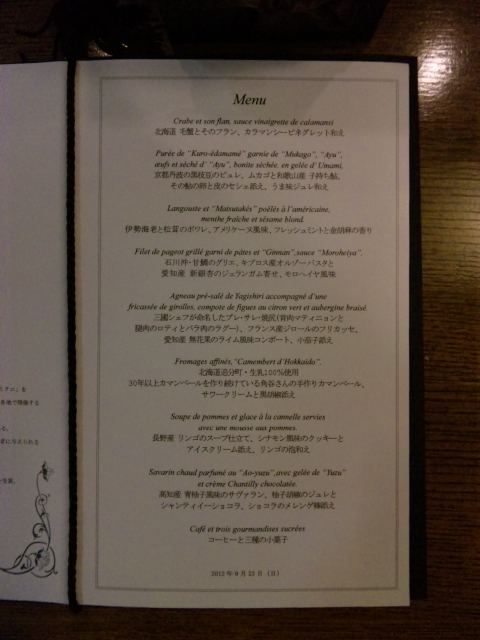 9月23日(日)、雨です。最近の天気予報は良く当たりますね。本日はホーム1:GSCC東コースでのプライベートラウンド。8時45分OUTスタートとのこと。6時15分に起床。BSでPGAツアー・プレーオフ最終戦を見ながら、新聞に目を通し、朝食を済ませ、ロマネちゃんと戯れ、身支度。7時15分頃に家を出る。7時45分頃にコースに到着。フロントで記帳して、10月の月例杯の予約と思ったら既にキャンセル待ち…10月のプロアマ研修にエントリーして、着替えて、練習場へ…。ショット…マアマア…、パット…中止…。シトシト雨のままですね。本日は東コースのブルーティー:6906ヤードです。OUT:0.1.2.0.0.0.1.1.1=42(11パット)1パット:7回、3パット:0回。パーオン:2回。ティーショットの飛距離があまり出ません…。ラフからのショット…飛びません…。欲張るとトラブルです…。アプローチとパットで何とか…。スルーでINへ…。IN:2.1.0.2.0.1.3.0.1=46(17パット)1パット:2回、3パット:1回。パーオン:1回。金曜日から痛かった右の手首が痛み始めました…。ダフリ・トップが多発です…。42・46=88の28パット…。いいとこなしですが、握りに勝てたことが救いか…。お風呂に入って、会計を済ませて、退散…。本日のフィジカルチェック…171.5cm,65.2kg,体脂肪率18.2%,BMI22.2,肥満度+0.8%…でした。やばいな~!帰宅して、女子~男子のゴルフツアーをTV観戦しながらしばらく休憩ですね。夕方からは名古屋へGO!17時15分のJRで名古屋へ。マリオットアソシアの「ミクニナゴヤ」へは18時10分頃に入店。本日はミクニフェアです。お席は満席。本日のメニューはこんなです。相変わらず満足させていただけます!一緒に楽しんだのは…シャンパーニュ:失念。白ワイン:1999シュヴァリエ・モンラッシェ・レ・ドゥモアゼル(ルイ・ジャド)赤ワイン:1985シャトー・マルゴーコンディションも問題なく美味しくいただけました。お心遣い…ありがとうございます!!タクシーにて帰宅。当然熟睡!いい気持です!!