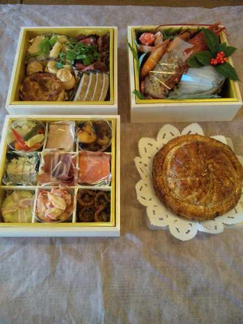 12月31日(水)、晴れですね。とうとうやって来ました、2014年最後の1日です。そして年末年始休暇の第4日目…折り返し点ですね。昨夜はシャンパーニュ、日本酒と飲んでいたのでヘロヘロのいい気分でした…。そして9時頃に起床…、そのころは少し曇っていたかな…。新聞に目を通し、朝食を済ませ、ロマネちゃんと戯れ…、年末恒例行事(大掃除)の続きです…。高いところの窓ガラスと網戸を掃除して、玄関の飾りつけをして…、お昼です。残すは、庭の落ち葉掃除ですか…。右腕が痛くなってきたよ~!1USドル=119.37円。1AUドル=97.95円。1NZドル=93.61円。米国株が下落、薄商いのなか利食い先行ドルが対円で下落、年末控え利益確定の動き=NY外為市場北海ブレント先物57ドル割り込み5年半ぶり安値、供給過剰懸念でNY原油先物、一時5年8か月ぶり安値30日のニューヨーク原油先物市場の時間外取引で、指標となるテキサス産軽質油(WTI)の2月渡し価格は、一時、1バレル=52・70ドルと2009年5月以来、約5年8か月ぶりの安値をつけた。1バレル=100ドルを大きく超えていた今年半ばから、ほぼ半分まで値下がりしたことになる。(読売新聞)93兆円、市中で年越し=日銀緩和で過去最高日銀が30日発表した2014年末の日銀券発行残高によると、市中に出回ったまま年を越す紙幣(お札)は前年末比3.3%増の93兆817億円となり、5年連続で過去最高を更新した。日銀券発行残高は、個人の財布や会社の金庫、現金自動預払機(ATM)の中などにある紙幣の量。93兆円を全て1万円札にして積み重ねると高さは約930キロメートルとなり、富士山(3776メートル)の約246倍となる。(時事通信)庭の掃除も完了!栗とブランデーの効いたパウンドケーキと紅茶でおやつタイム。そして、今年のおせち料理も届きました。今夜はおせちをつまみながら、ワインを楽しんで終わりですね…。さあ、2014年の最後の晩餐のスタートです。可児市のフレンチ「ラ・ミラベル」のおせちがメインです。一緒に楽しんだのは、2010シャンボール・ミュジニ(メオ・カミュゼ)です。美味しくいただいています。この後はかにすきのようです。
