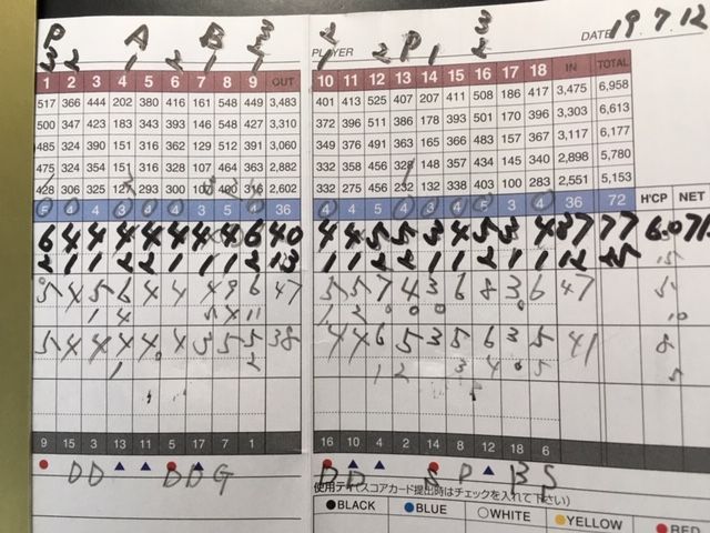 7月17日(水)、曇り~晴れでした。予報では一日曇りだったような…。そんな本日は、ホーム1:GSCCの東コースで開催のプロアマ研修会に参加させていただきました。10時28分スタートとのことですから、6時30分に起床。ロマネちゃんのお世話をして、新聞に目を通し、朝食を済ませ、身支度。洗濯物を片付けて、1階のモップかけも済ませる。7時45分頃には家を出る。8時15分頃にはコースに到着。混雑していると思ったらゴルフ雑誌「ALBA」のゴルフトーナメントを開催しています。夏のジュニア大会の練習ラウンドのチビッ子も…、腕は相当でしたが…。フロントで記帳して、着替えて、コーヒーブレイクして、練習場へ…。ショット…イマイチ…、パット…イマイチ…。本日の競技は西コースのブルーティー:6613ヤードです。ご一緒するのは、N君(12)、Oさん(18)、Iさん(19)です。本日の僕のハンディは(10)とのこと。OUT:1.0.2.1.0.1.0.0.3=44(18パット)1パット:2回、4パット:1回、パーオン:2回。1打目のミスが5回、2打目のミスが3回、3打目のミスが1回、アプローチのミスが2回、パットのミスが5回…。1番ロングの50ヤード強のアプローチ(3打目)をザックリしてショート、4打目アプローチでピンそばにつけるもパーパットを外す…。9番ミドルは40ヤード強のアプローチ(3打目)がやや右に出る、そこからのパーパットを外して、お先にを外して、さらにお先にを外して、4パットの素トリ…。完全に切れました…!10番のスタートハウスで辛子豆腐をいただく。途中から日差しが強くなって暑いです…。終盤はヘロヘロ…。IN:0.2.0.1.-1.1.1.2.1=43(14パット)1パット:4回、3パット:0回、パーオン:1回。1打目のミスが2回、2打目のミスが4回、3打目のミスが1回、4打目のミスが1回、アプローチのミスが3回、パットのミスが2回…。切れたゴルフは立ち直らず…。すべてのクラブでフェードボールを打つ練習に特化しました…。いいボールも出るし、ひどいのも…。物に出来れば武器になりますね。14番ショートは178ヤードを4Uで綺麗にフェードが打ててピン手前にぴたりとついてバーディー!44・43=87(10)=77の32パット…。何の期待もできません。来月のハンディアップに貢献か…?スコアカードを提出して、靴を磨いて、お風呂に入って、会計を済ませて、早々に退散です。本日のフィジカルチェック…170.0cm,62.5kg,体脂肪率19.3%,BMI21.6,肥満度-1.7%…でした。兆度、東京から帰りの奥が近場のJRステーションに到着するとのことで、途中でピックアップして帰宅。帰宅すると16時少し前。千疋屋の桃のケーキとアイスコーヒーでおやつタイム。それではしばらく休憩です。1USドル=108.22円。1AUドル=75.85円。本日の日経平均=21469.18(-66.07)円。昨夜のNYダウ終値=27335.63(-23.53)ドル。金相場:1g=5314(-25)円。プラチナ相場:1g=3269(+9)円。(読売新聞)NYダウ終値23ドル安、利益確保へ売り注文 日経平均終値、66円安の2万1469円 本日の東京市場ではチェック中の日本株30銘柄中の15銘柄が値を上げて終了しましたね。配当・優待期待3銘柄では1銘柄が値を上げて終了しましたね。(ブルームバーグ)米国株が反落、対中追加関税にトランプ氏言及 米銀大手に米金融政策の逆風、純金利収入に影響表れ始める ビル・ゲイツ氏が3位に後退、世界2位の富豪はアルノー氏 (会社四季報オンライン)(ロイター)米株は反落、銀行業績や貿易巡る懸念が圧迫ダウは23ドル安の2万7335ドル(株探ニュース)【市況】明日の株式相場戦略=変化に対応して買い出動を(msn)(プレジデント・オンライン)富裕層がエルメスのバッグを買う真の目的 本日の競技の成績速報が出ていますね。本日の競技には19人が参加して、トップは75(8)=67とのこと。僕は87(10)=77で16位…。お疲れ様でした。(オートカー・デジタル)字幕付き動画 メルセデス-AMG A35 目標はA45 競合メガーヌRS/ゴルフRとの差は(yahoo)(トレーダーズ・ウェブ)明日の戦略-薄商いのなかであっさり21500円割れ、参院選前後の波乱に要注意NY株見通し-上値の重い展開か 決算発表はバンク・オブ・アメリカなど(yahoo)(モーニングスター)明日の日本株の読み筋=もみ合い商状か、決算前で様子見続く今晩のNY株の読み筋=バンカメなどの決算に注目(yahoo)(時事通信)〔東京株式〕小幅続落=貿易摩擦不安が再燃(17日)☆差替〔NY外為〕円、108円台前半(17日午前8時)〔米株式〕NYダウ、ナスダックとも小動き(17日午前)今夜のNY市場ではチェック中の米国株20銘柄中の11銘柄が値を上げてスタートしましたね。重点5銘柄では4銘柄が値を上げてスタートしましたね。