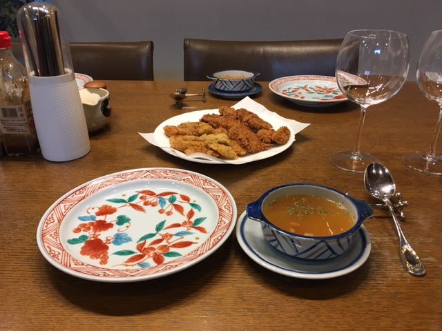 ヒレカツ、カキフライ、野菜サラダ、野菜スープでした。