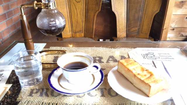 移動の合間に「緑の館」でロイヤルブレンドとトーストを楽しむ。