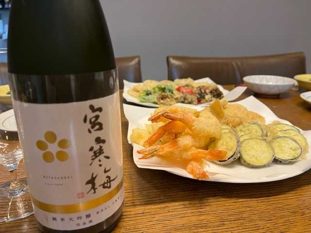 夕食は天ぷら各種と宮寒梅の出品酒を楽しむ。