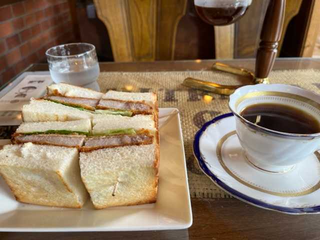 ランチタイムは緑の館でロイヤルブレンドとクラブハウスカツサンドをいただく。