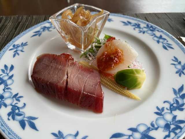グラスでシャンパーニュを2杯と赤ワインを1杯いただいていい気分です。