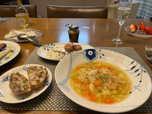 本日の夕食は、ミネストローネ、焼き野菜、パン、デザート(イチゴ)でした。