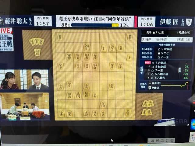 アベマTVで竜王戦の第4局を放送していますが、藤井竜王が優勢のうちに終盤へ入ってきましたね。