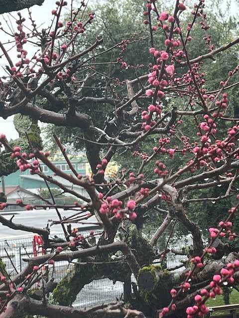 雨に打たれながら、庭の紅梅の開花が近づいています。