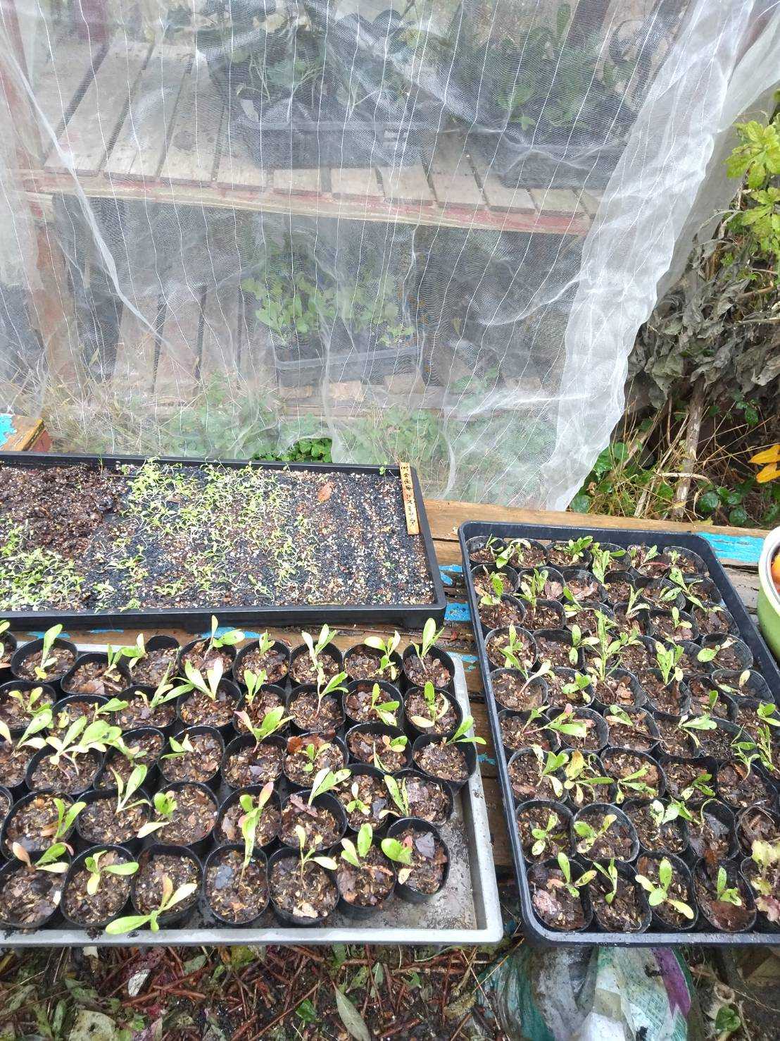キンセンカをポットへ。 左はカスミソウ 今日 ポットへ移す。右側はレタス…