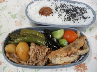 そうしゅです。暑さもいよいよ本番ですね。関東も梅雨明けだそうですが、ろくに雨降らなかったので水不足が心配です。今週は夏風邪にやられてぐだぐだでした。まだ酷い咳と鼻水と関節痛に悩まされていますが、今日はしばらくぶりにお弁当作りました。インゲン肉じゃが風インゲンの味噌天ぷら結び昆布の甘煮ミニトマト香の物ごはんには梅干しとふりかけです。巨大インゲンをいただいたので肉じゃが風に煮てみました。これがけっこういけます。インゲンとじゃが芋と豚肉だけですが、かなり美味しいです。巨大インゲンが30本、あっという間になくなりました。インゲンの味噌天ぷらはお弟子さんにいただいた物です。図らずも、ダブルインゲンになりました。www風邪は治るまでもう少しかかりそうです。困ったなあ。