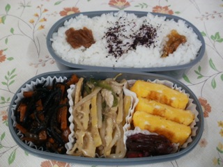 お久しぶりです。前回から一ヶ月くらい経ちましたかね。なんとか生きてます。最近、旦那のお弁当が激減したのもあり、あんまり写真撮らなくなりました。で、撮らないとアップの仕方を忘れるし、めんどーになります。今は週に二回程度しかお弁当ないからねえ。舞台まで一ヶ月を切り、今、いろいろいっぱいいっぱいです。お弟子さんの追加稽古に追い回されて殺されそうです。ふえぇぇぇ・・・