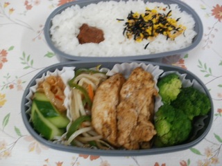 外はいいお天気です。午前中に整骨院に行ってきました。連休明けで混んでいたけど、おかげで院内に置いてあるジャンプをゆっくり読む事が出来ました。wwwここのところ手首や肩の調子がいいので嬉しい。まだ正座はできないけど膝の痛みは完全になくなったし、足も随分曲がるようになってきました。でも先生力強いから終わるとあちこち痛いし全身だるいです。大好きなドラマ「CSI.NY7」を見てからお昼食べてたらなんか怖そうな映画始まったので敵前逃亡。今日のお弁当です。チキンムニエルカレー味ピーマン添えカボチャのレモン煮キュウリと冷製クラゲの和え物香の物こんなかんじです。食べた後カレーの匂いがするとお客さんに申し訳ないので、旦那のお弁当に「ブレ○ケア」をひと粒添えました。食後に噛まずにお飲みください。