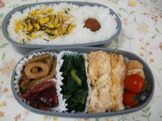 こんにちは、そうしゅです。今日もいい天気です。外にほとんど出ないので実感できませんが、多分外は今日も暑かったのでしょう。まだ稽古場の冷房はつけてませんが、いつまでがんばれるやら・・。私だけなら結構頑張れるのですが、やはりお弟子さんの事を思うと、あんまりにも暑くなったら冷房を入れないと。ご高齢の方は気づかないうちに熱射病や脱水症状になるので。それでは、今日のお弁当です。チキンカツ煮ミニトマトふきの煮物ほうれん草のおひたし香の物ごはんには梅干しとふりかけです。チキンカツは軽く煮てあります。ごはんにのせればカツ丼ですが、生憎二段弁当なのでのれませんでした。まあ、他のおかずも入れたいのでこれでいいと思ってます。ここ数日やけに眠いです。疲れてるのかなー。体調はそう悪くありません。調子こいて日曜に巣鴨に行く予定まで入れました。