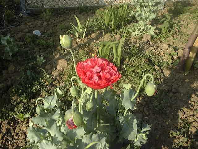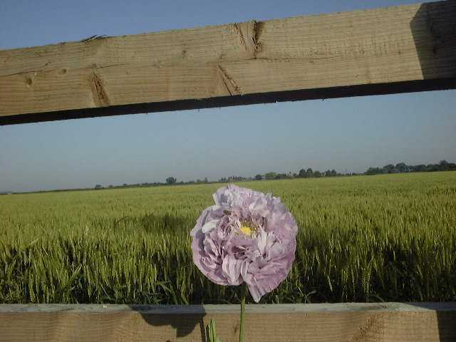 ケンブッリジの宿泊したモーテルの駐車場の片隅で見た花.木の柵の外は延々と続く麦畑.この花の名前はなんという花ですかね.(パリから車で,カレーを経由しドーバー海峡を渡りイギリスに入りケンブリッジで,宿泊した際のモーテルでの駐車場.)