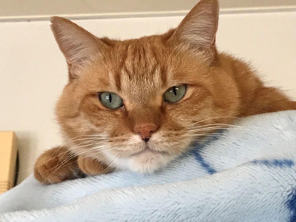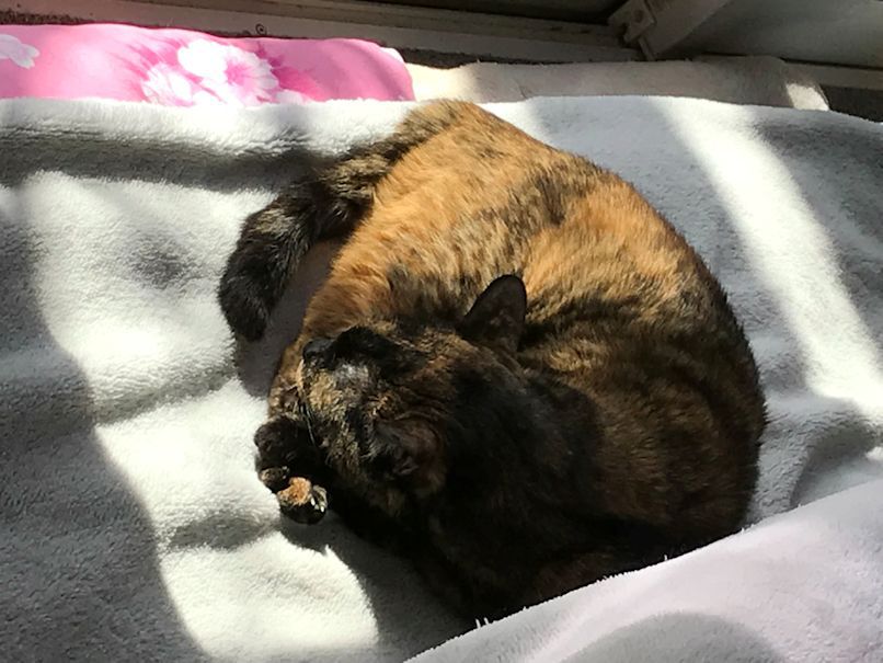 うちでは、唯一の男の子で末っ子の8歳です。大きくて重たい6.85キロの茶トラ猫。趣味は、バードウオッチング。庭に来るキジバトとスズメを見ています。甘えん坊で、アレルギー体質で、尿路結石ができやすく時々詰まってシッコが出なくなったり膀胱炎になったりします。うちの男の子は、代々弱い仔ばかりで、黄縞さんも病院通いが多いけど、まだ8歳なので元気はいっぱいです。