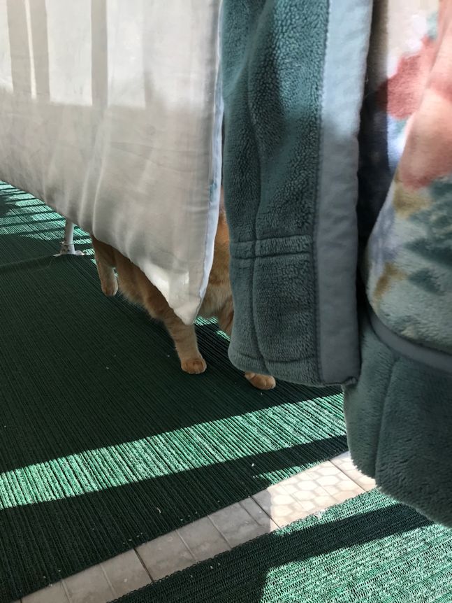 天気が良くて、最高気温も10度まで上がったので、久しぶりに布団干せました。黄縞さんも、ベランダに出て、はしゃいでいます。さすが、一番若い8歳です。うちのベランダは、網が貼ってあって外には出られませんが、日向ぼっこができます。毛布の向こう側に隠れながら、走る黄縞さん。どどどどど・・・けっこう早く走っている黄縞さん。端まで行ってから走って、こちらに向かってくる黄縞さん。ぐるぐる何周も走って、楽しそうです。