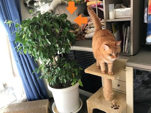 オレンジ色の矢印の先には、黒猫ショコラの個室(段ボールの中に猫ベットが入っていてペットヒーター完備)黄縞さんが、訪問したのですが、断られたらしく、戻ってきます。どうして~?納得いかない様子の黄縞さん。しかたなく降りて来ました。たいてい、ひとりで昼寝している黄縞さんですが、ちょっと寂しくなったのかな?この後、野分の部屋(こちらは本当に4畳半くらいの部屋です)に行って、一緒に眠っていました。野分は優しいお姉さんだからね。良かったね黄縞さん。黄縞さんは、末っ子の男の子だから、甘えん坊です。猫は、女の子の方が自立しているというか・・・成猫(おとにゃ)っぽい気がします。