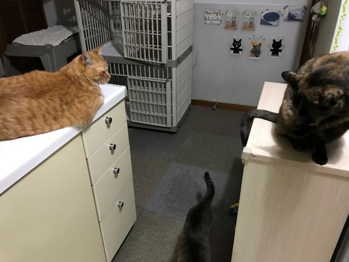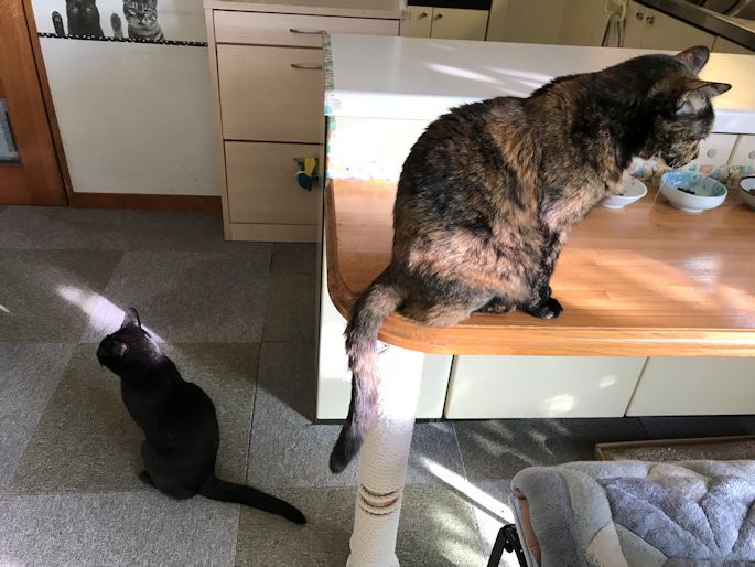 追いかけっこして遊んでいるうちに、ちょっと本気になってしまった2猫(ににゃん)紗羅(サビ猫14歳)が、カウンターの上に上がって避難。下には、ショコラ(黒猫13歳)がいて、どちらも相手を見ないようにしています。でも、やっぱり気になるらしく、チラチラ相手を見ます。しかも同じタイミングで、息ぴったり。やっぱり、本当は仲良しさん?