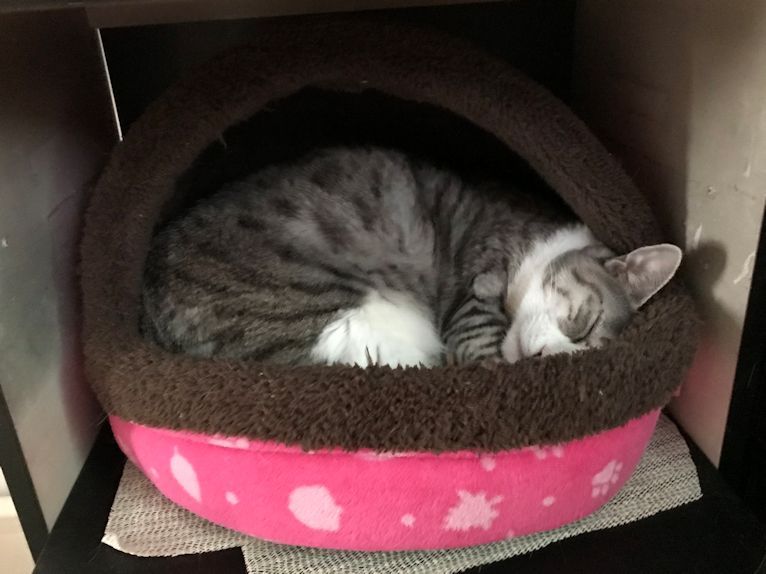 今降っているのは雨ですけど、これから雪になっていくかもしれません。寒い寒い一日でした。エアコン暖房は、24度設定で、24時間ずっとパワフル稼働中。加熱式加湿器も使っているので、部屋はポカポカなのですけれど・・・それでも、猫は、ますます丸くなって寝ています。棚の中に入れたベットで眠る野分。このベットは、中がふわふわでお気に入りです。黄縞さんは、三段ケージの天辺のベットで丸くなって寝ています。天井近くだから、とても暖かい場所なのに、こんなにまるまるです。