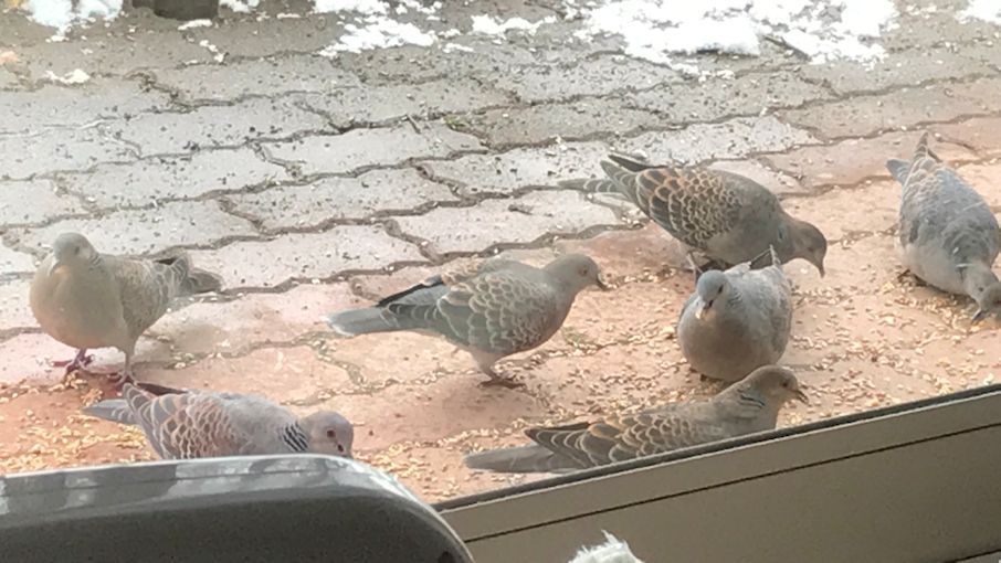 毎日、野鳥に餌をあげているので、キジバトも来ているのですが、こんなにたくさん来たのは初めてです。キジバトは、日本古来の野鳥でよく見かける鳩よりは、体が小さくて、夫婦(2羽)か、親子(4羽)で過ごしていて、群れでいた事はありません。それどころか、いつもは庭で縄張り争いをしていて、一緒に餌を食べる事はありません。でも、今日は雪が降ったので、特別みたいです。写真に一部分写っているキジバトだけで、11羽もケンカしないで一緒に餌を食べています。こんなにたくさんのキジバトが一緒にいるのを見たのは初めてです。私は感動して見ていたのですが・・・黄縞さんは、耳を寝かせて、本気のガン見。たぶん美味しそう~捕まえたい~と思っているのかな?家の庭で、野鳥に餌をあげ始めたのは、小学生だった息子でした。今日は、キジバトがたくさん来ていましたが、ウグイス・ヒヨドリ・モズ・メジロ・カモ・キジ・スズメも来ています。変わったところでは、カワセミも来た事が有ります。そして、キジバトが来るようになったのは、今から20年近く前に、高校生になった息子が、怪我をして飛べない鳩を拾って、10年ほど飼ってからです。拾ってきたのは、よく公園などに居る伝書鳩風の大型の鳩でしたが、こぼれた鳩の餌をねらって、野鳥のキジバトが来るようになりました。その鳩が死んでしまってからも、キジバトが毎日くるので、ずっと鳩の餌をまいてあげています。去年は、家の倉庫でヒナも生まれたりしたことも、また書こうと思います。