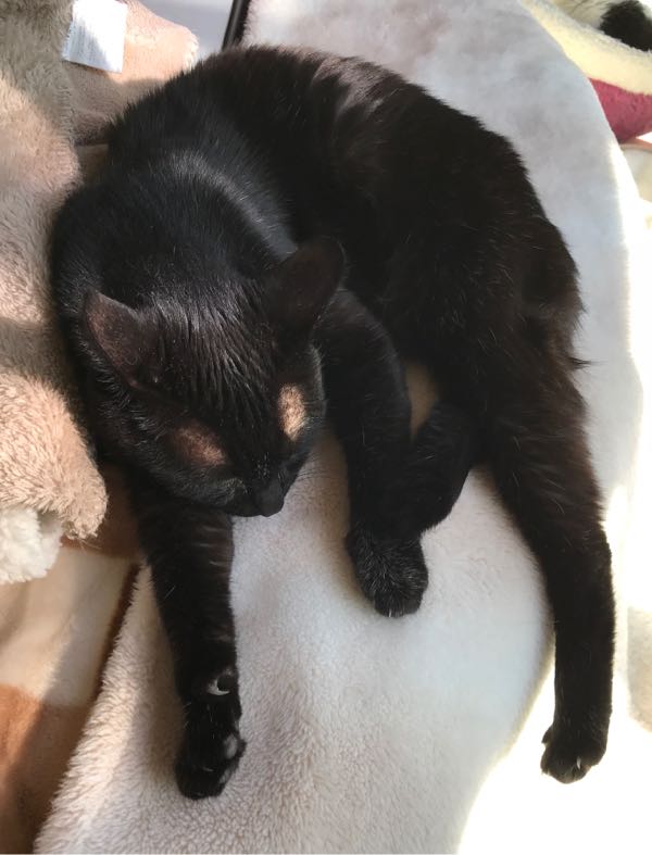 同じく、陽だまりのショコラ。 ショコラは、目の上の部分の毛が薄いので この角度で写すと大きな目?みたいに見えます。 べつの角度なら、ちゃんと黒猫です。