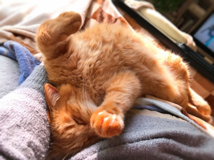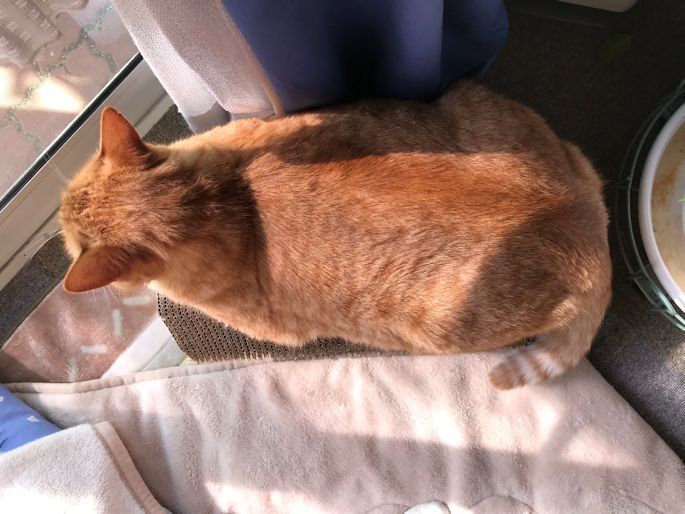 強い風が吹いた昨夜の野分と黄縞さん。大きな猫ベットに、ペットヒーターを入れて、毛布をかけた上に、仲良く寝ています。エアコン設定は24度で点けっぱなしで、部屋も暖かいから、伸び伸び寝ています。今日の昼過ぎの2猫(にゃん)ほら、日中だから、カーテンが開いてるでしょう?うちに居る猫は、元々は、病気や怪我や先天的な疾患持ちの捨て猫や外生まれの猫です。20年ほど前に、夜間の室温を16度にしていた時、白血病や猫エイズなどの免疫不全を起こす疾病を持った猫たちは、せいぜい5~6歳くらいの寿命で、体調も崩しやすく動物病院通いが続きました。そこで、18度設定にしてみると、風邪ひきで通院する回数が減りました。さらに20度にすると、もっと丈夫になりました。それで、調子に乗って24度にしてみると、誰も風邪を引かなくなりました。もちろんワクチンはずっとしています。でも、室温を上げたほうが、病気にはなりにくくなりました。たぶん、もともと猫は砂漠の生き物だったからじゃないかと思ったりしています。