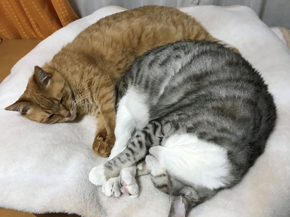 同じ年の野分(♀グレー縞)と黄縞さん(♂茶トラ)は、とても仲良し。たぶん、生まれたのは2ヶ月くらいの違いだと思います。一緒におおきくなったので、本猫たちは姉弟と思っています。だから寝るのも一緒。ご飯も一緒。時々、フギャーフギャー姉弟げんかもしますけれど、すぐに仲直りして一緒に眠ります。