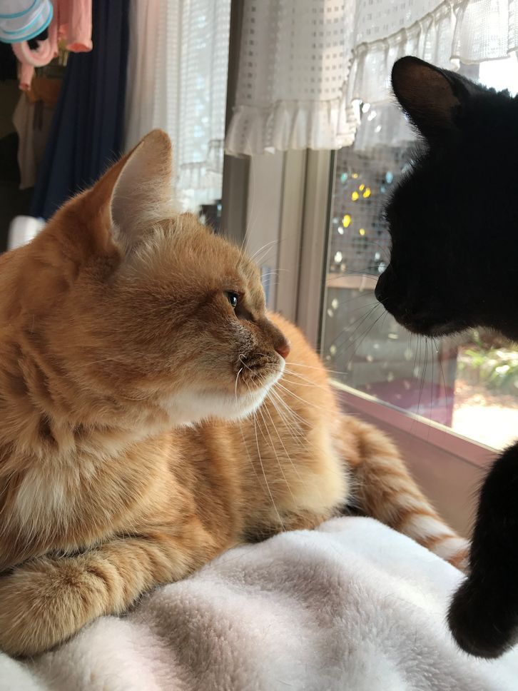 ショコラ(♀13歳)と、黄縞さん(♂8歳)ひそひそ・・・内緒話。家で、たったひとりの男の子の黄縞さんは、誰とでも仲良しです。だから、気が小さくて気難しいショコラも、こんなに近くにいても優しい表情をしています。小さい頃から、黄縞さんは、ショコラが大好きで、嫌われても叩かれても噛まれても、黙って近くに座っていました。根気強く、毎日毎日・・・一年くらいかかりましたが、近付いてもショコラが怒らなくなり、今では、こんなに仲良くなりました。