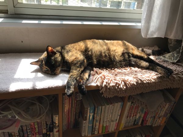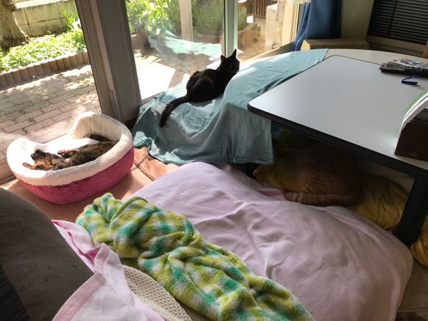 このところ夏日が続いたので、日向ぼっこの場所の毛布を、綿の布に替えました。夏らしくなりました。ショコラも、のびのびして気持ち良さそうです。ちなみに、冬は、こんな感じで毛布を敷いてました。寝ているのは、サビ猫の紗羅です。急に暑くなったので、猫ベットの中のペットヒーターを取り出したり、毛布を薄手の物に変えたりしています。春らしい季節が無くて、寒い冬から、いきなり夏日になったような気がします。ここ数年、長袖のシャツを着る機会がないまま、半袖の季節になっている感じがします。