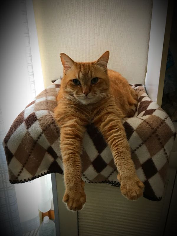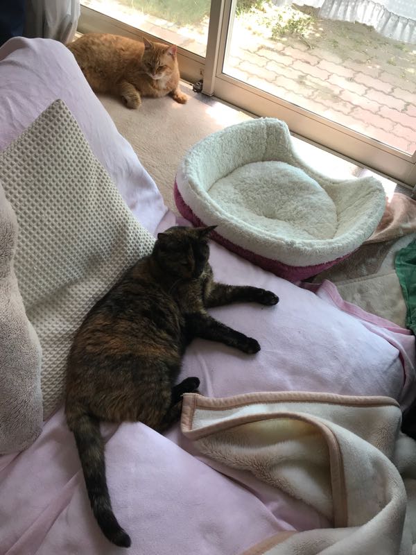 気温は30度になり、しかも湿度が高いので、夏らしい蒸し暑い日になりました。黄縞さん(♂8歳)は、やっぱり今日も伸びて寝ています。でも紗羅(♀16歳)は、ヒーターの入ってる猫ベットで寝ています。年齢が上がってきたり、痩せ気味の猫は、寒がりなようです。今いる他の仔たちもリンちゃん(♀16歳)と、ウニ姫(♀16歳)ショコラ(♀13歳)は、まだヒーターの入ってる猫ベットを使っています。この子達は、年齢が上がるとともに、体重は減ってきています。人と同じように、痩せると寒いのでしょうね。ヒーターの無い方を選んでいるのは黄縞さん(♂8歳)と野分(♀8歳)この子達はまだ若手で、体重も6.85キロと5.54キロと太目なので暑がりです。うちには高齢な猫が居るので、ヒーターはまだ使っています。梅雨明け頃に、全部のヒーターを取りますが、秋の彼岸頃には、また使い始めます。なので、ペットヒーターは、ほぼ一年中使ってる感じです。