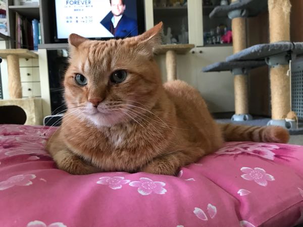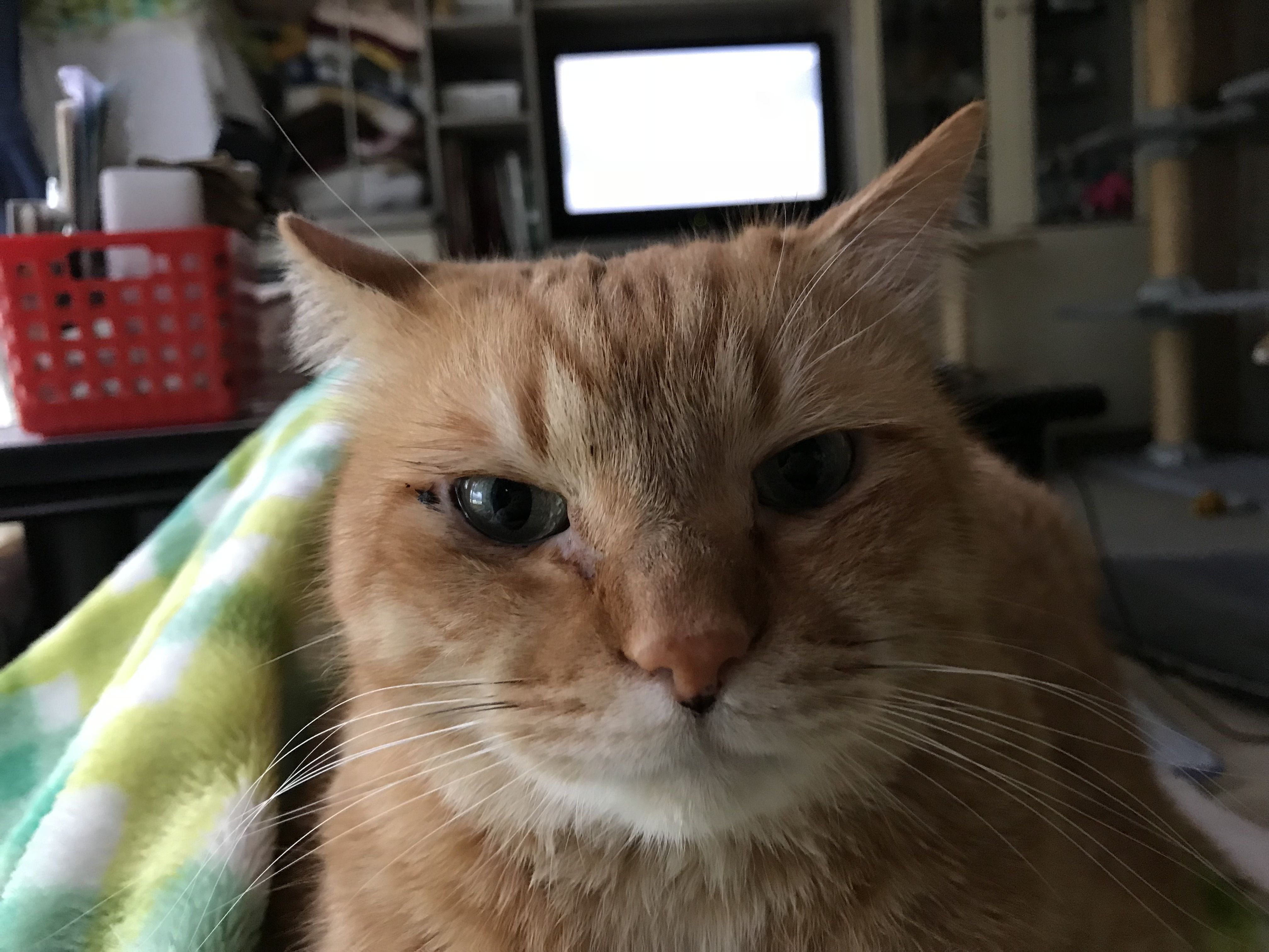 ゴールデンウィークなので、アニメの一気見をしていますがこんな感じです。テレビ画面は遠く、黄縞さんが、非常に近い。ほとんど黄縞さんを見ている感じです。しかも、黄縞さんの表情は「僕を見て!」と言ってる気がします。観えませんよ~退いてくださいと、頼んでみても、聞こえないふりをしていて動きません。まあ、アニメと猫と、ふたつの好きなものを同時に見られるので、この状態は、ラッキーと言えるのかもしれません。どうでしょう?リンちゃんの服薬は、今日は出来ています。ヤレヤレひと安心です。