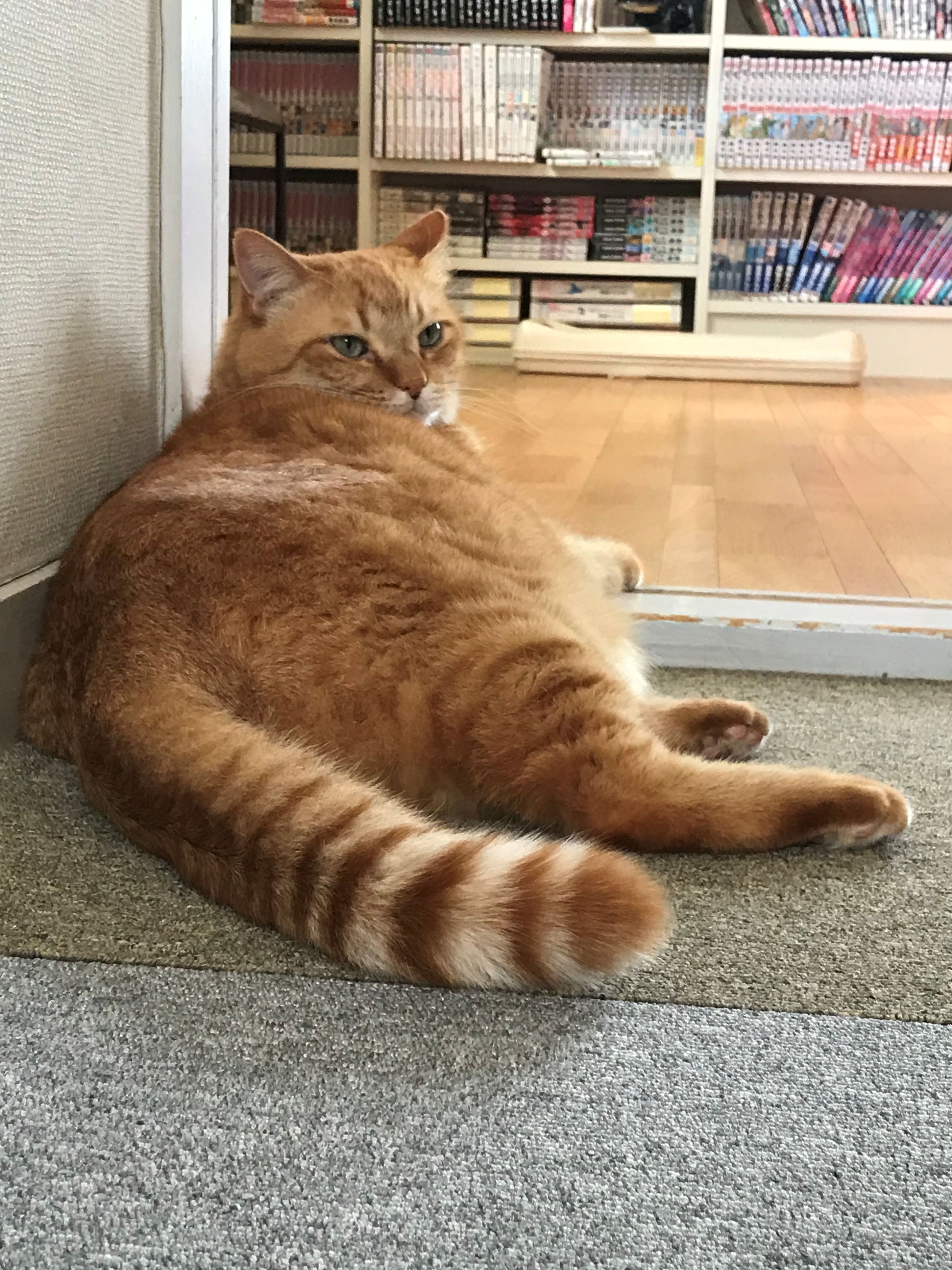 さらに、黄縞さん自慢。黄縞さんのチャームポイントは、大きなシッポ。真っすぐで長くて、ふわふわフサフサです。そして、たまらない魅力なのは、大きな足。ガッシリとした感じの、やや短足。でも、そこが可愛いさのツボでもあります。もちろん、キリッとした顔も可愛い。というより、なんでもうちの仔が一番可愛いのです。