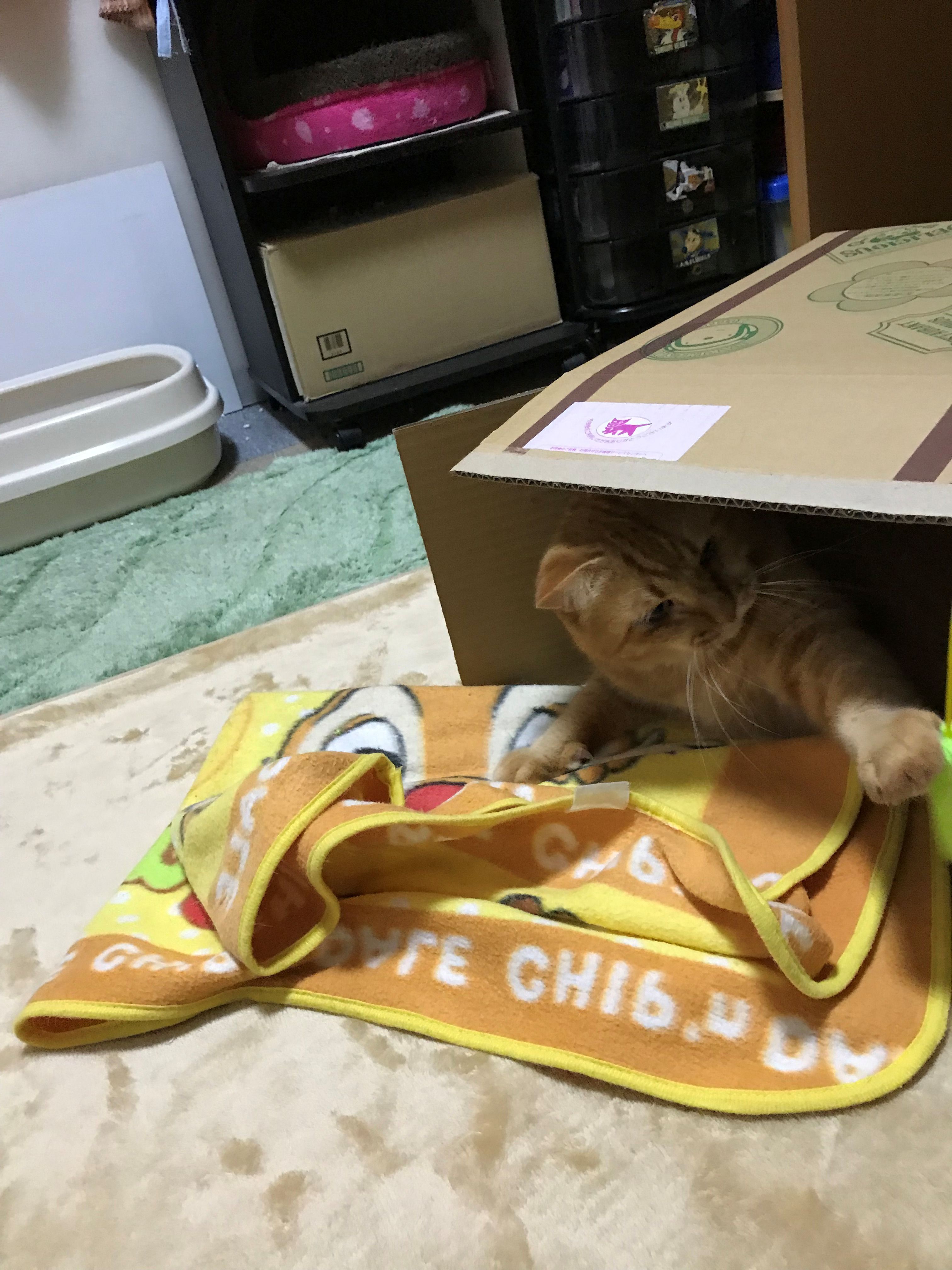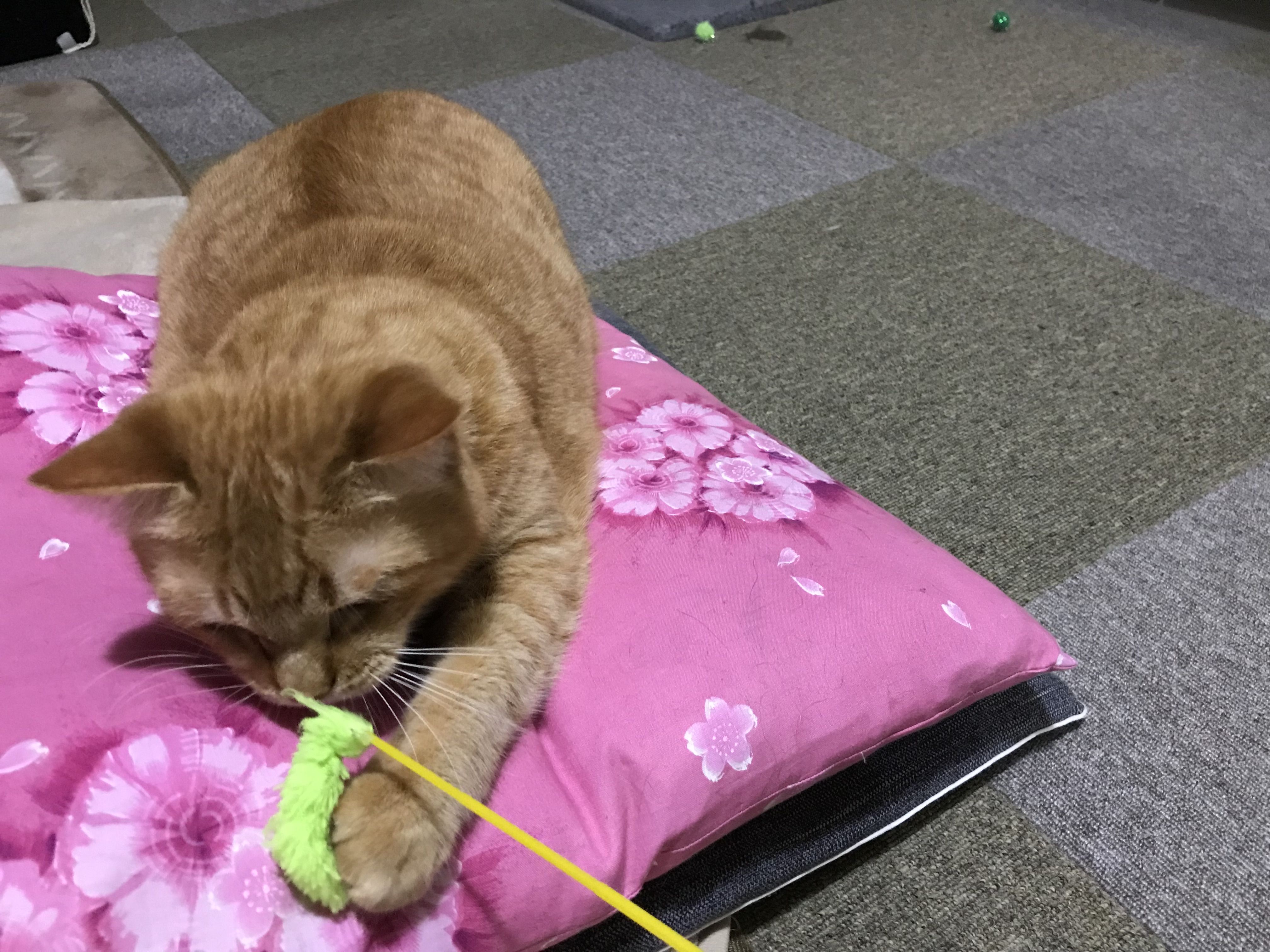 若い頃は、猫じゃらしをパタパタ振るとすぐに飛びついて、ひたすら追いかけていた黄縞さんですが最近は、箱の中に隠れて、ササっと手だけだして、猫じゃらしを捕まえようとしたり毛布の陰に隠した猫じゃらしを探しだしたりして遊ぶようになりました。黄縞さんも、ずいぶん成猫(おとにゃ)になってしまったな~と思います。