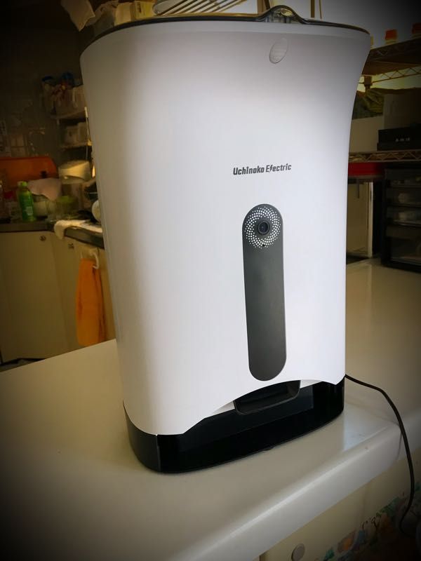 こんな感じのマシーンです。 カリカリを、 セットした時間に、指定した量だけ自動で付属の皿に出してくれるだけじゃなく スマホから指示して カリカリを出す事もできます。 さらに、録音した声で ごはんだよ〜 みんなおいで〜 などとスピーカーから流す事もできます。 スマホに話しかける言葉を、スピーカーから聞かせる事もできます。 そして 部屋の様子を、ライブで見る事ができて、写真やビデオも撮れます。 ちょっと、歪んで見えてます。 左の青いカーテンの下の、黒い点がショコラです。