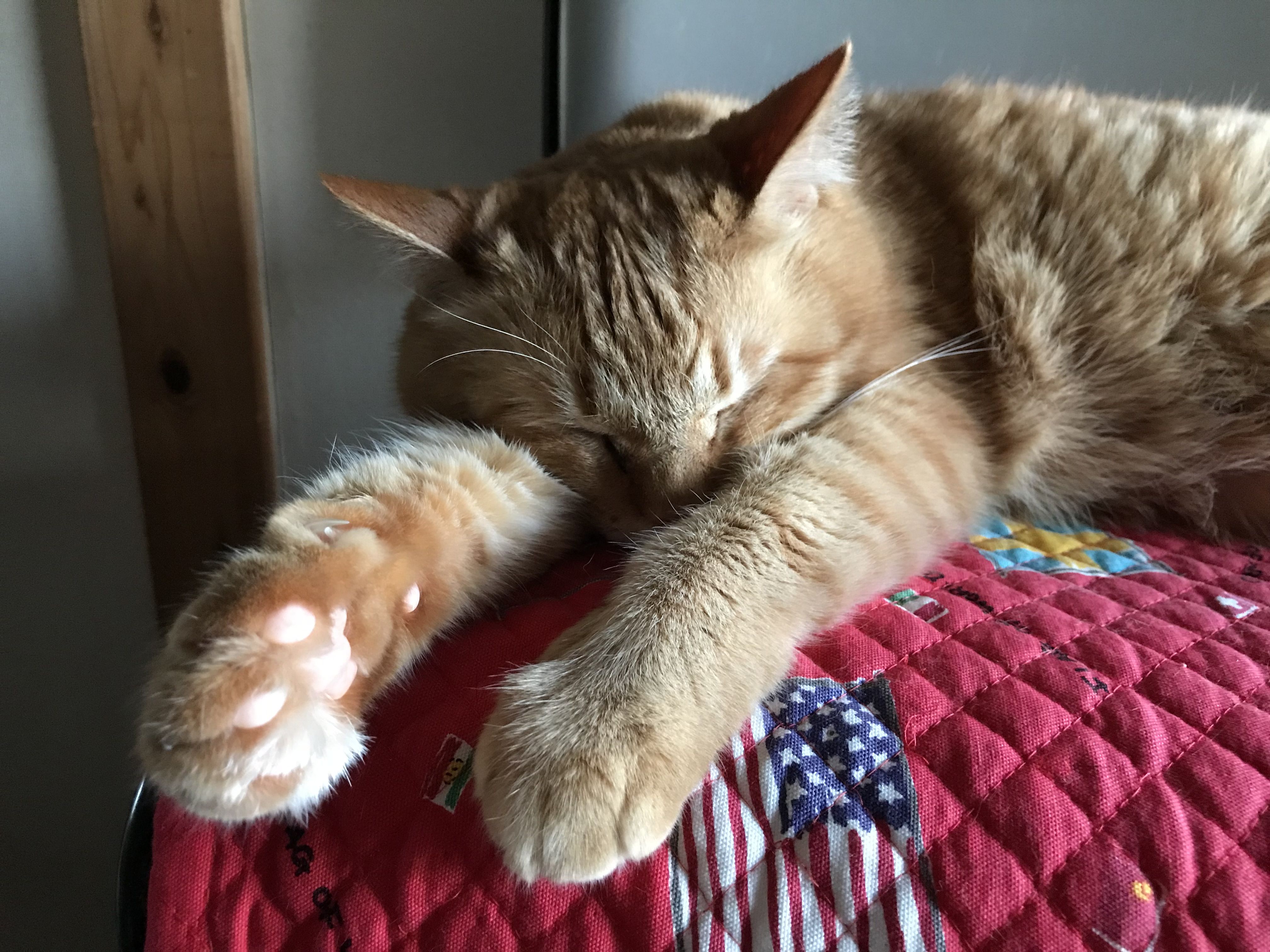 お昼寝の黄縞さん(♂8歳)可愛い〜と思い急いで写真を撮りました。足の ギュ〜〜 が、ツボ!シッポの J が可愛いポイント!近くでショコラ(♀13歳)が遊んでいます。黄縞さんは、のんびりな男の子だから神経質なショコラも、安心して遊んでいられます。